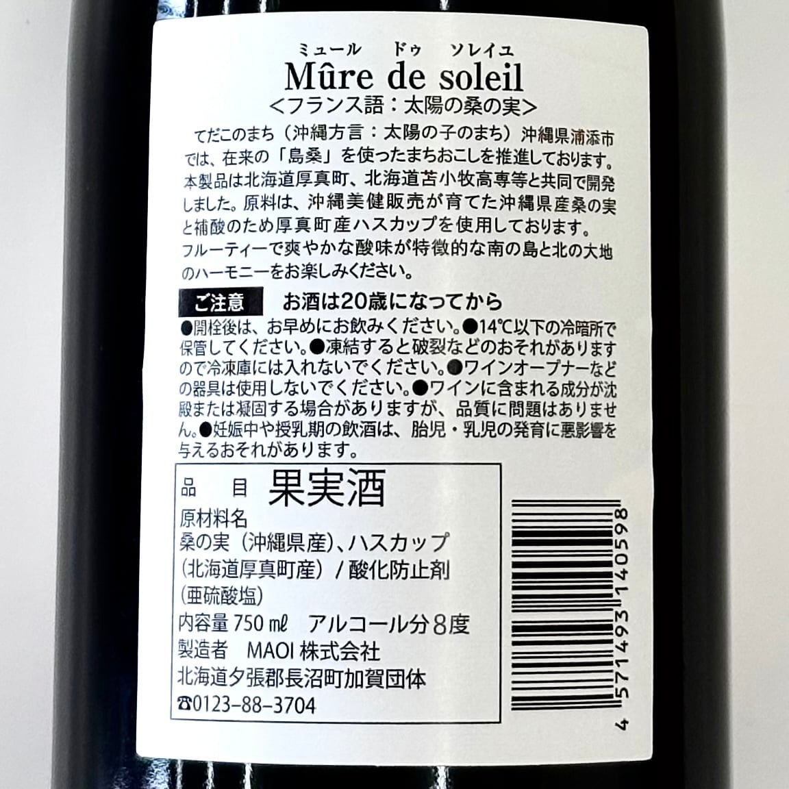 浦添市の特産品である島桑(桑の実)と厚真町の特産であるハスカップをブレンドした赤ワイン「Mure de Soleil(ミュール・ドゥ・ソレイユ)」は、2018年に浦添市と北海道厚真(あつま)町、苫小牧工業高等専門学校との共同研究により開発され、今回で5回目の生産